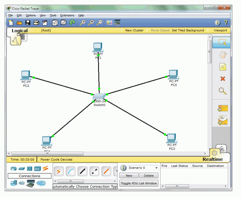 3. Kemudian letakkan Sebuah Hub mengelilingi 5 PC tersebut. Hubungi tiap PC dengan kabel. Untuk jenis kabel ,anda jangan khawatir, akan ada pilihan yang secara otomatis menyesuaikan jenis kabel. Dan tampilanya seperti berikut :